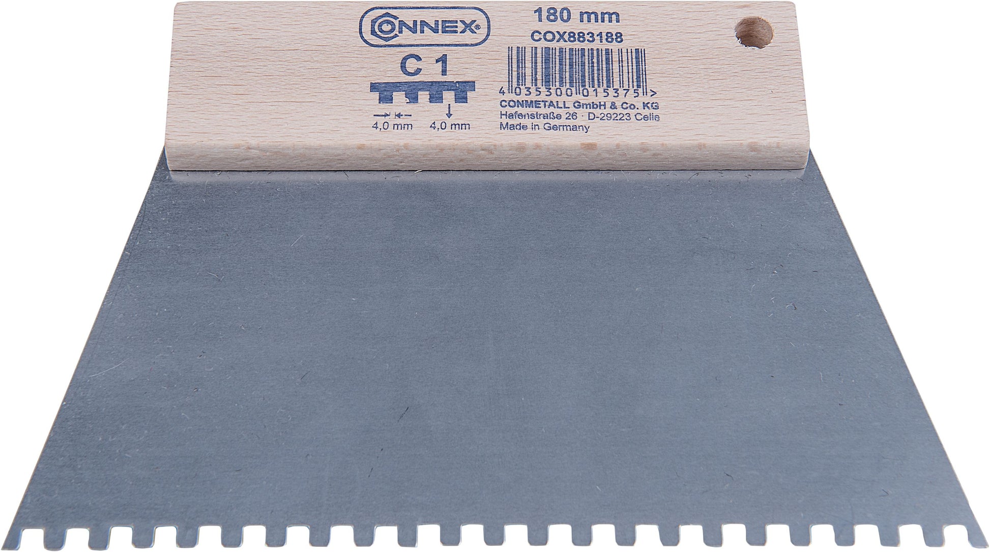 Spezialspachtel aus Stahl mit Holzgriff" Gezahnte Arbeitskante: Viereckzahnung C1 = 4,0 x 4,0 mm" Für das Auftragen von Fliesenkleber, Belagkleber, Styropurkleber