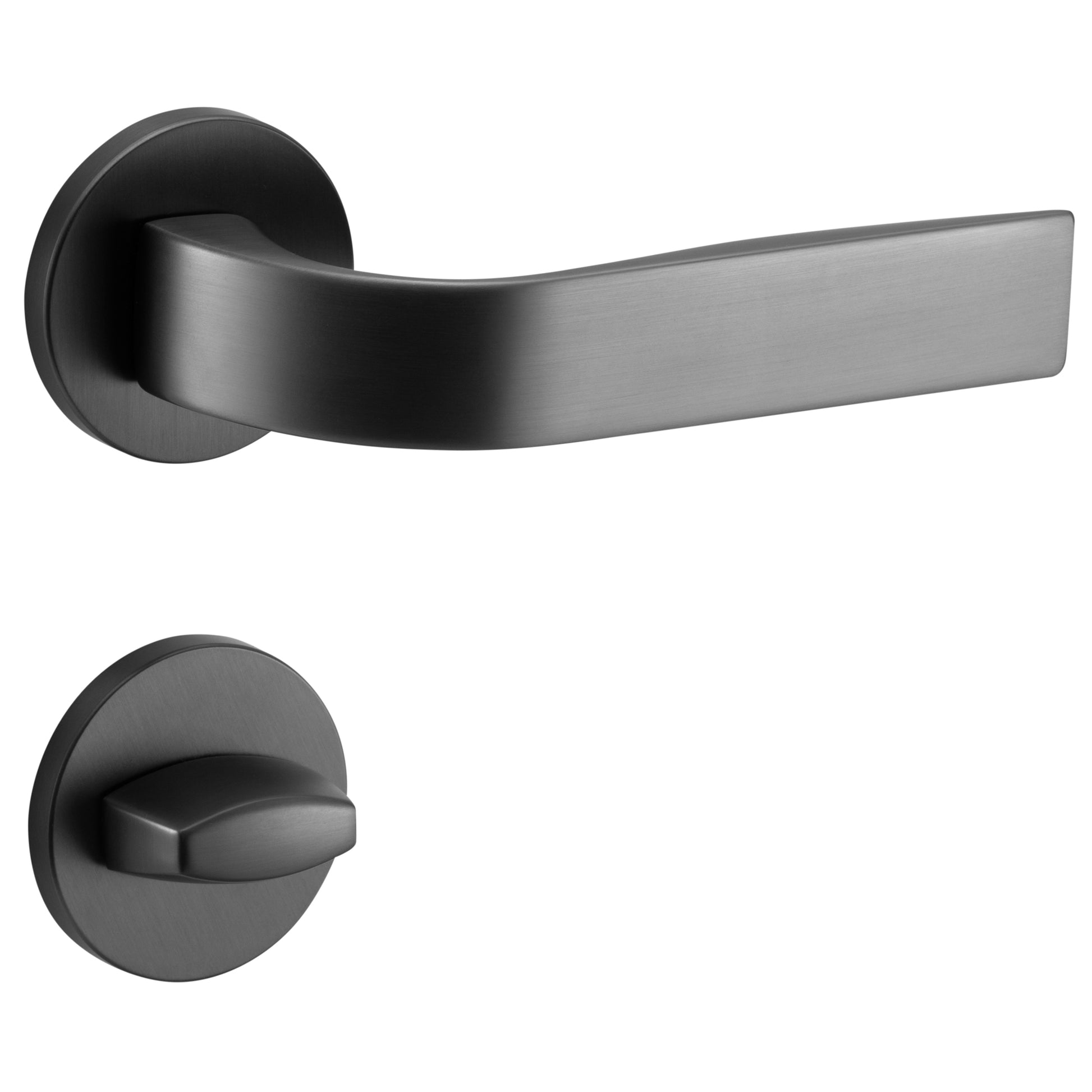 Die Rosettengarnitur Roya in WC-Ausführung aus Zamak titanium bietet eine hochwertige, funktionale Lösung für Badezimmer- und Toilettentüren. Mit einer Bohrung von 8 mm (BB) und einer Rosettenstärke von 6 mm besticht diese Garnitur durch ihre stabile Konstruktion und das elegante, moderne Design.